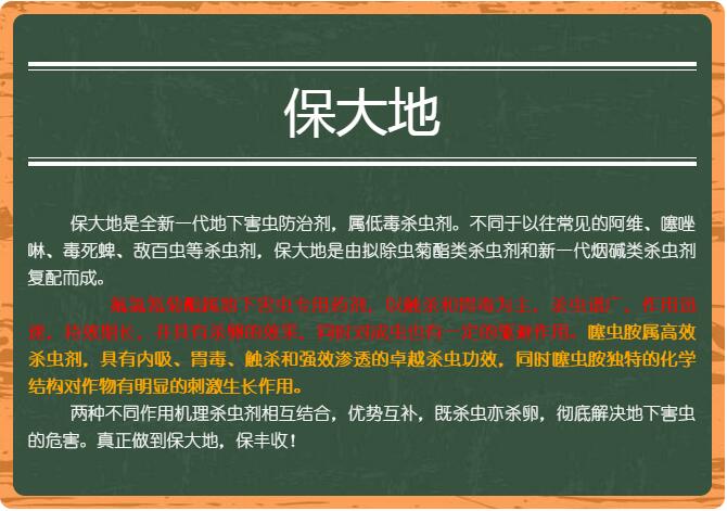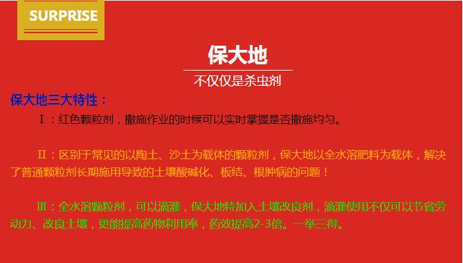 2、土壤處理:撒施顆粒劑,每畝使用保大地2-3袋,于傍晚時(shí)分均勻施撒于地面,可確保地下害蟲晚上出土?xí)r******殲殺。
