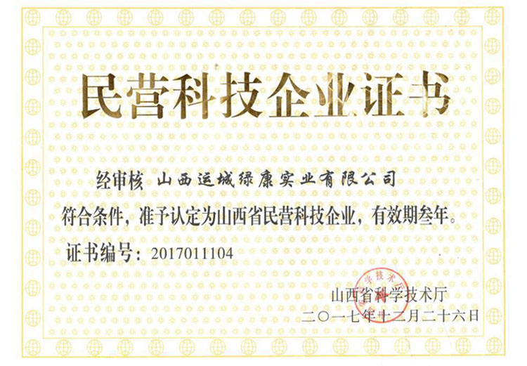 日前,山西省科學技術(shù)廳授予我運城綠康實業(yè)公司《民營科技企業(yè)證書》,正式認定我公司為山西省民營科技型企業(yè)(證書號:201701110)。